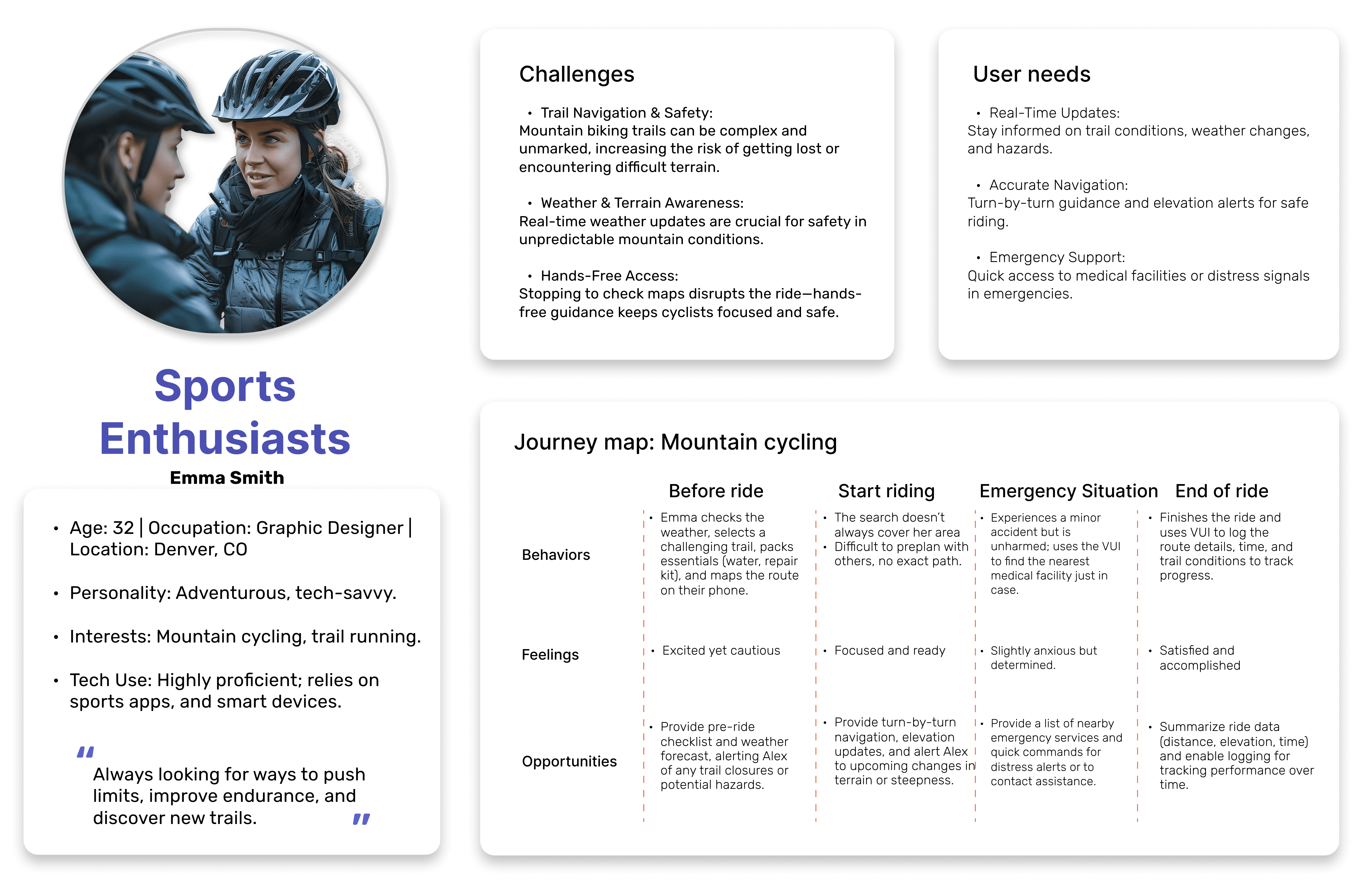 We designed Trek for sports enthusiasts who seek hands-free, intelligent navigation. After testing different user needs, we selected Emma, a tech-savvy cyclist, as our primary persona to ensure real-time updates, seamless interaction, and safety support on the trails.